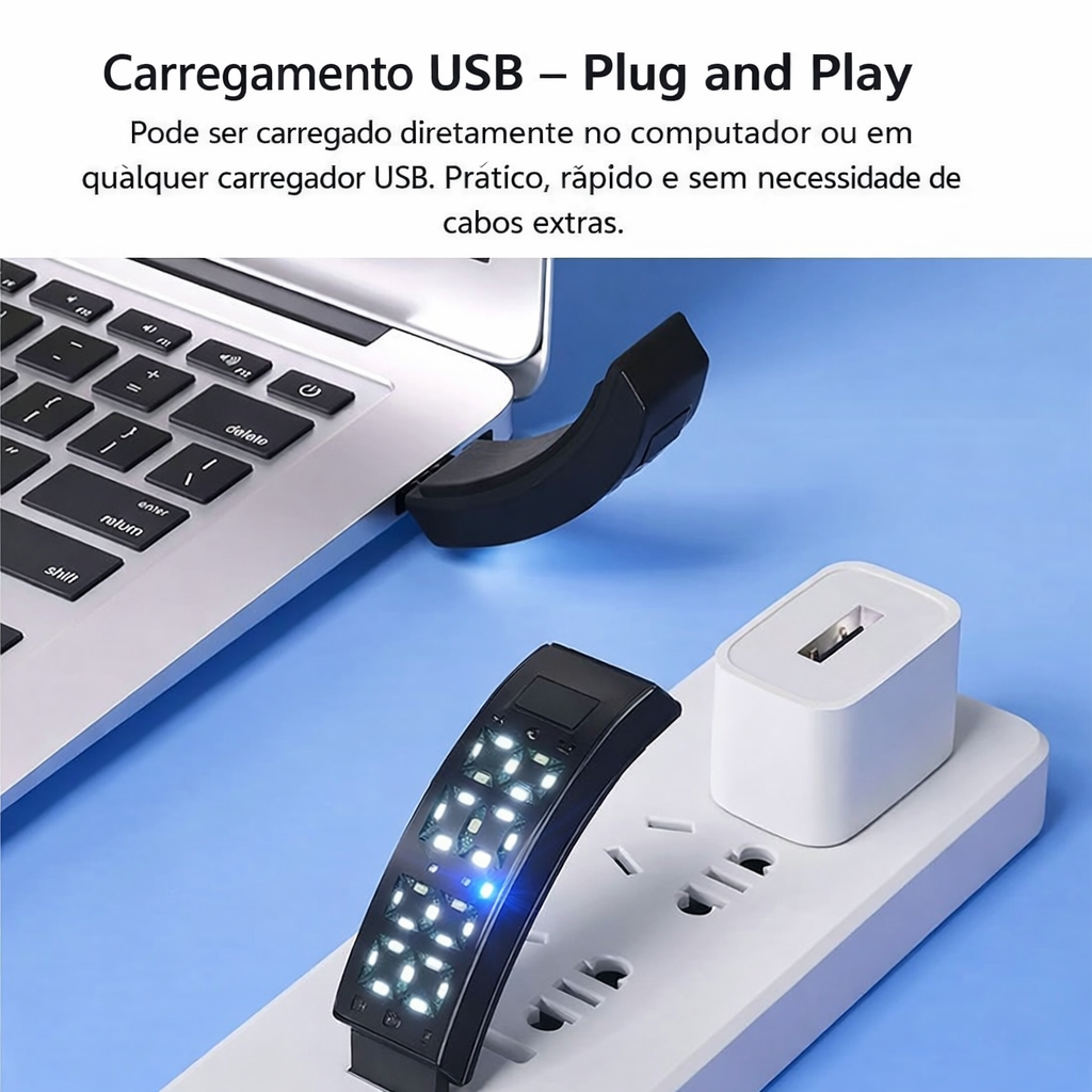 🔌 Carregamento: USB direto (sem cabo extra) — plug and play.