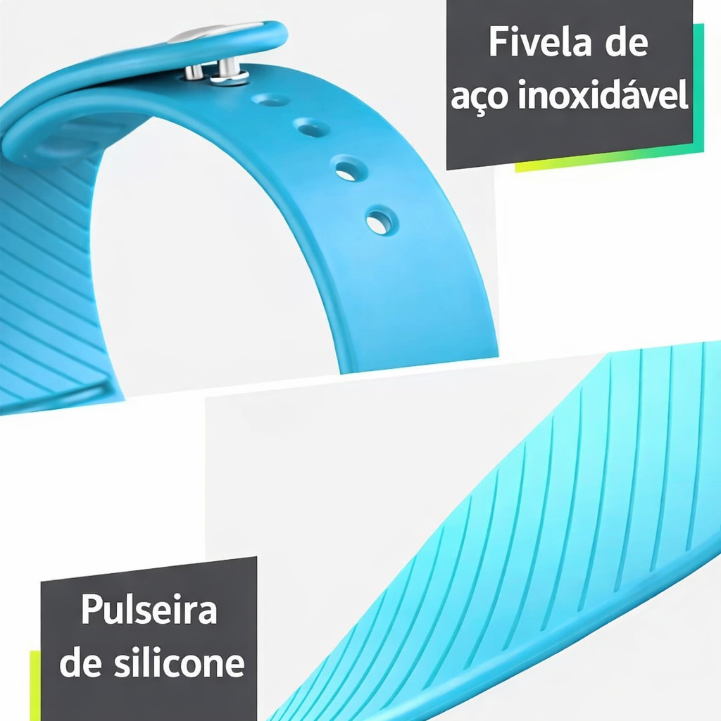 📦 Corpo / Case: Geralmente ABS (plástico leve e durável) junto com a pulseira de silicone.