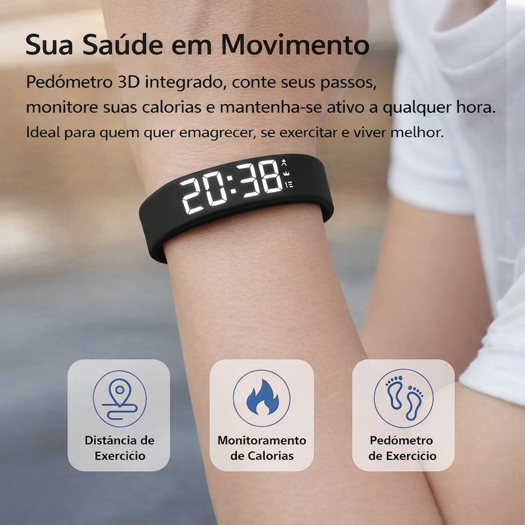 📱 Tela: Visor LED digital para visualização clara de horas e informações de atividade.